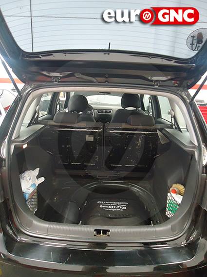 Opciones de cilindros en el baúl → 60, 65 o 70 litros | En el lugar de la rueda de auxilio → 2×30 litros | Imágenes → Instalación Volkswagen Suran, equipo Italiano GNC 5ta. Generación, con 2 cilindros de 24 lts. colocados en el espacio de la rueda de auxilio.