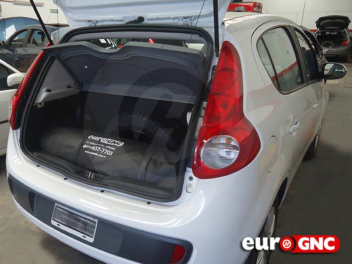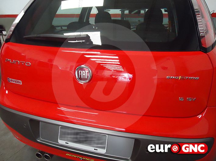 Opciones de cilindros en el baúl → 40 o 60 litros | Bajo chasis → No se puede | Imágenes → Instalación Fiat Punto Sporting 2013, equipo Italiano GNC 5ta. Generación, cilindro 40 lts.