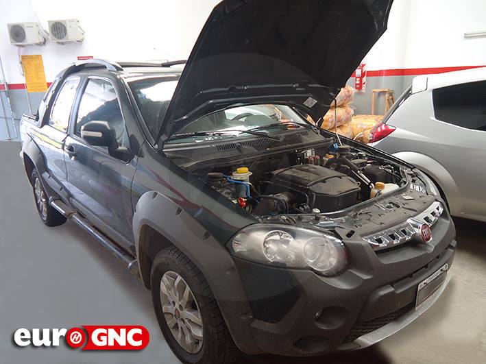 Opciones de cilindros en el baúl → 60, 65 o 70 litros | Bajo chasis → 2×30 litros | Imágenes → Instalación Fiat Strada Adventure, equipo Italiano GNC 5ta. Generación, con 2 cilindros de 40 lts. bajo chasis